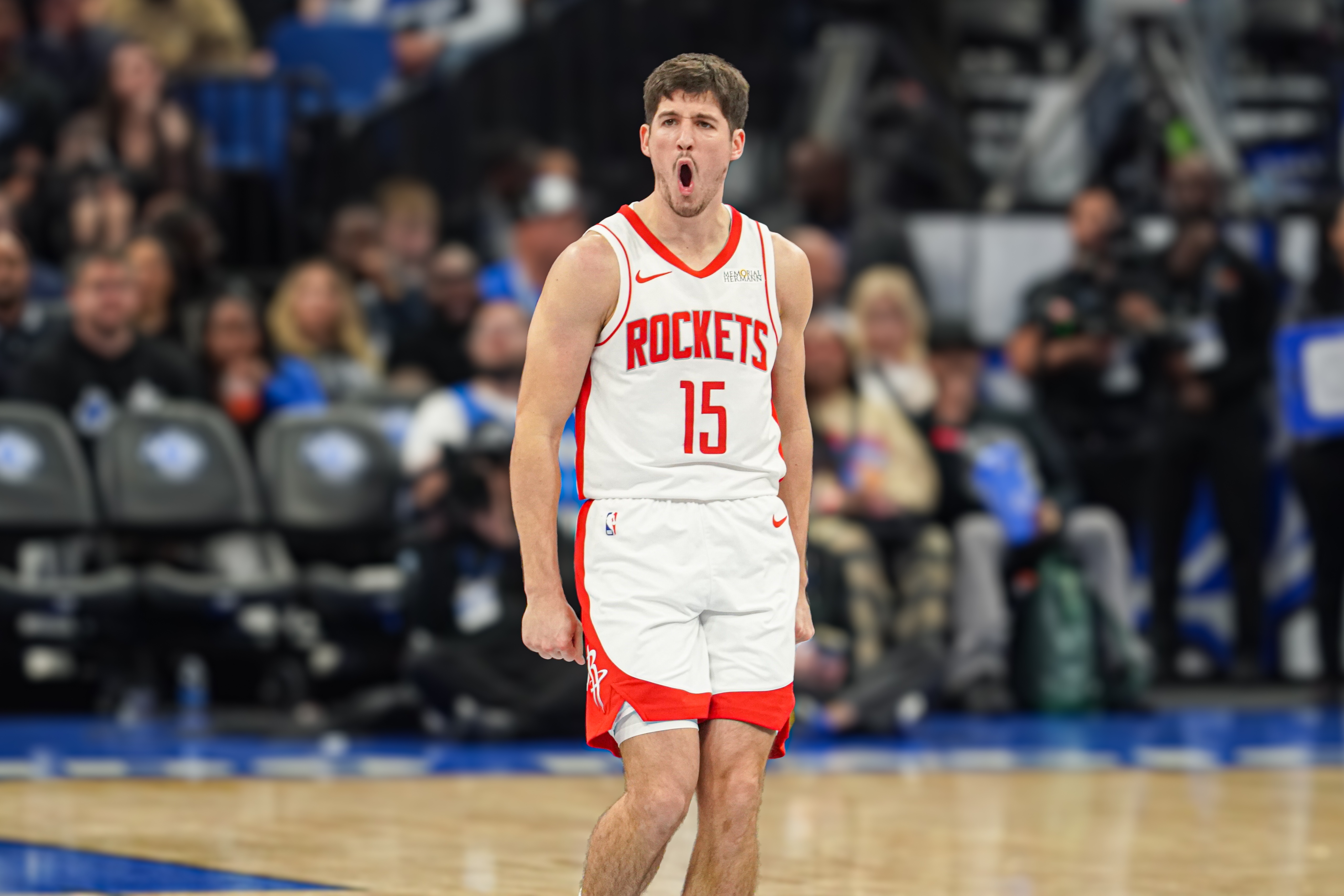 火箭采用了谢泼德/阿门→申京→杜兰特的传接球模式,申京作为最重要的中转站连接过半场的持球人和杜兰特。谢泼德上首发的一个好处是他比伊森投射更稳定,能固定带走一个防守人,毕竟火箭过去阿门+申京+3月份目前三分32中2的伊森同时在场实在太堵了。